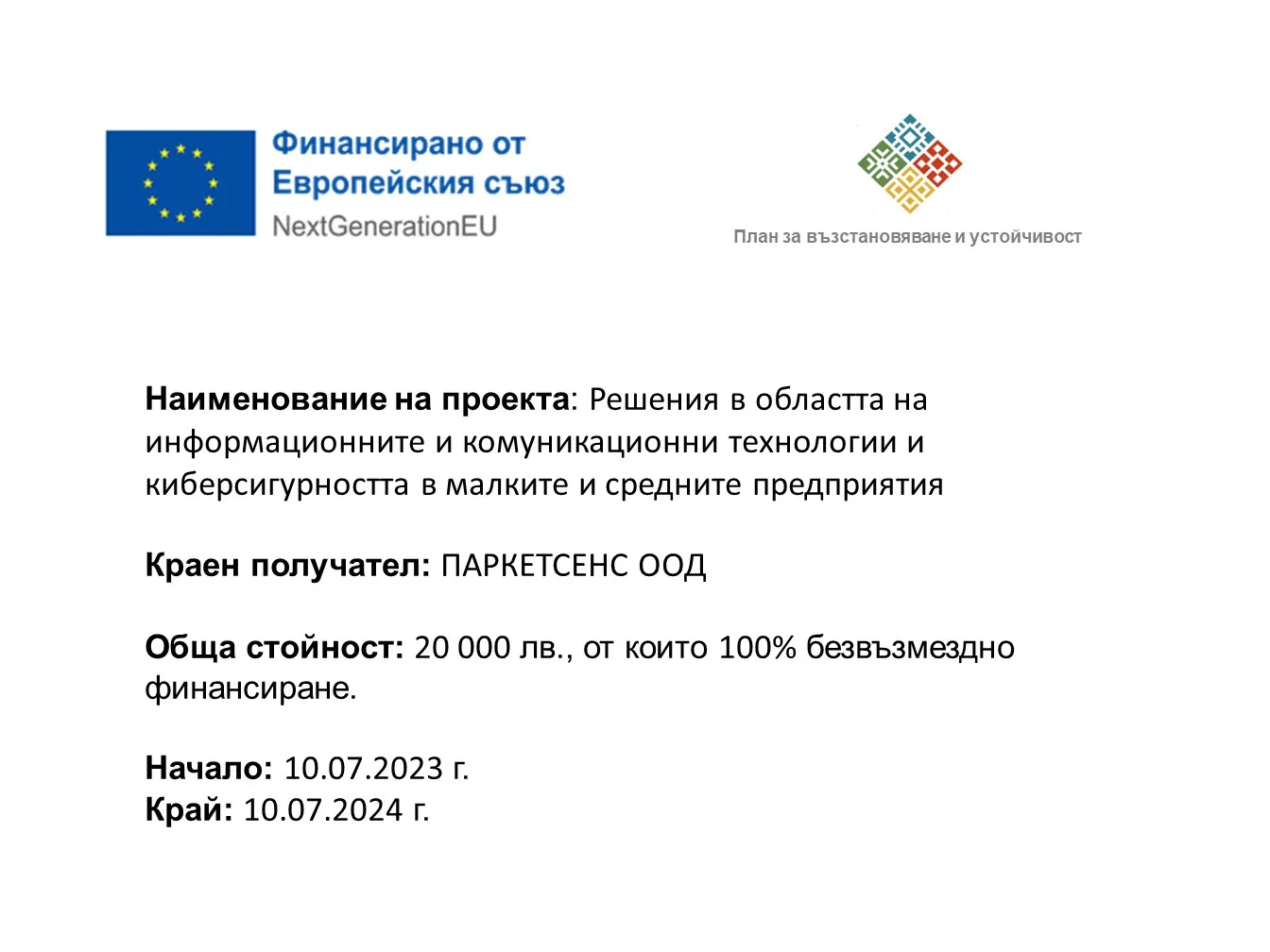 ПАРКЕТСЕНС ООД реализира проект по Процедура чрез подбор на предложения „Решения в областта на информационните и комуникационни технологии и киберсигурността в малките и средните предприятия” по Договор BG-RRP-3.005-2400-C01 в периода 10.07.2023 г. -10.07.2024 г. Проектът се състои в Въвеждане на система за управление на ресурсите (ERP система), като общата стойност е в размер на 20 000 лв., от които 100% безвъзмездно финансиране по Плана за възстановяване и устойчивост.
